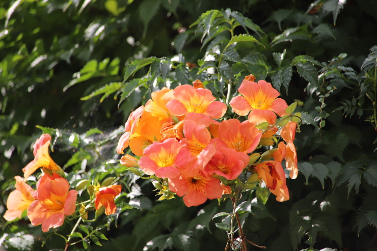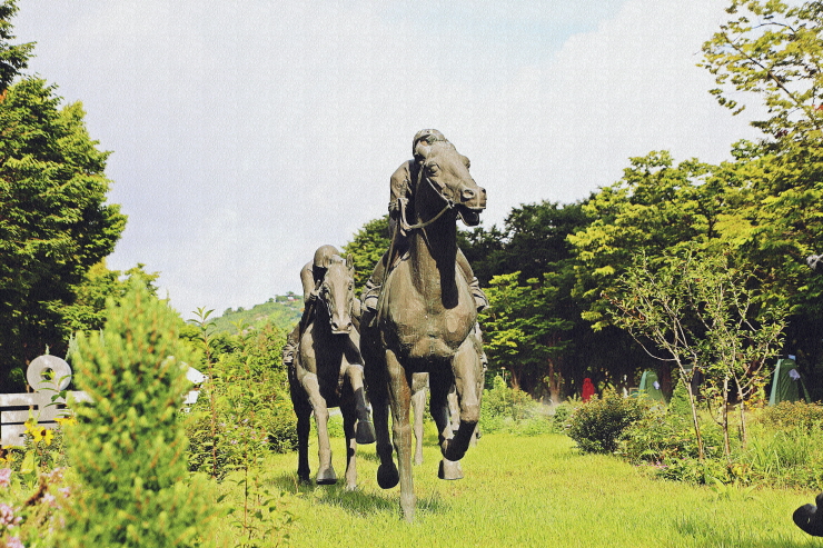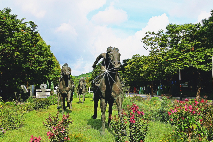 다양한 군마상. 수국. 맥문동. 능소화. 연못이 다양한 풍경.