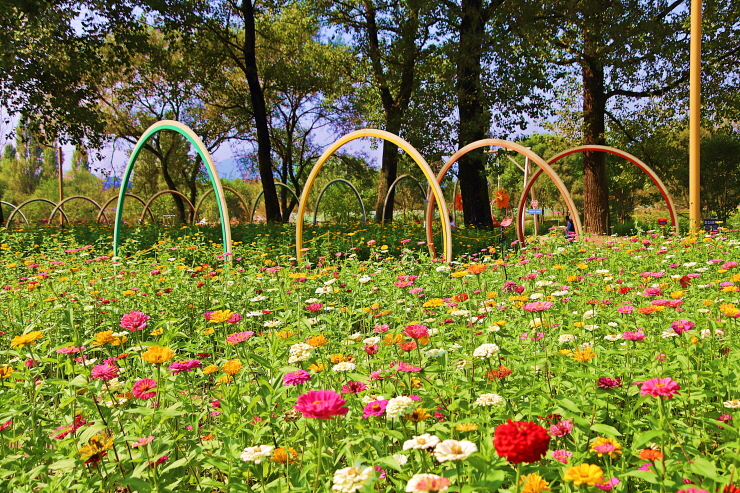 꽃동산 포토죤. 핑크뮬리. 조형물. 무지개칼라링.