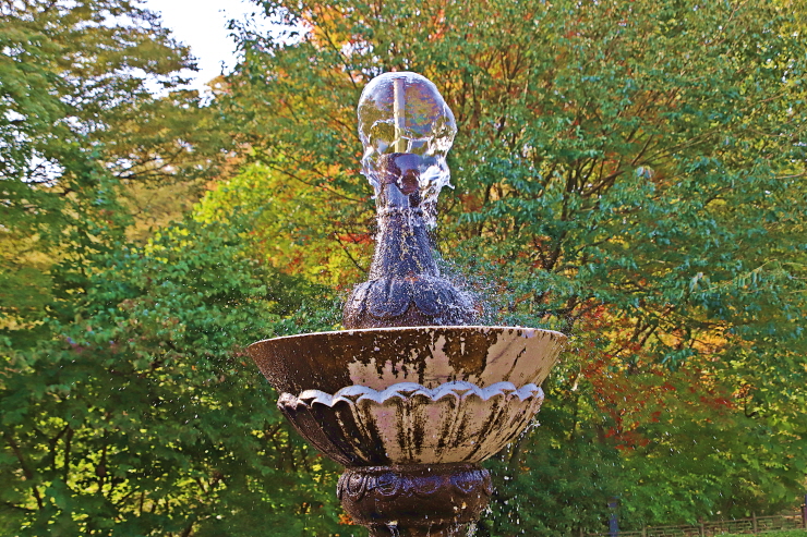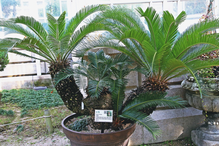 유자나무. 소철. 분수. 풍경. 맨드라미. 풍경.