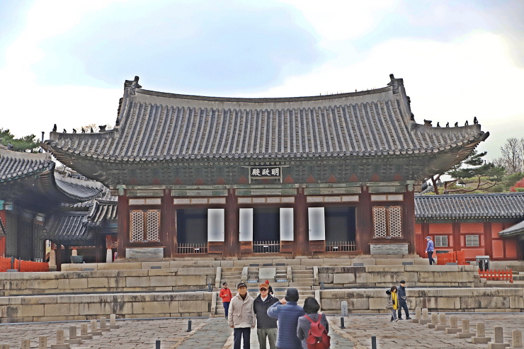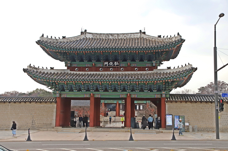 홍화문. 명정문. 명전전. 회화나무와 느티나무(공생).