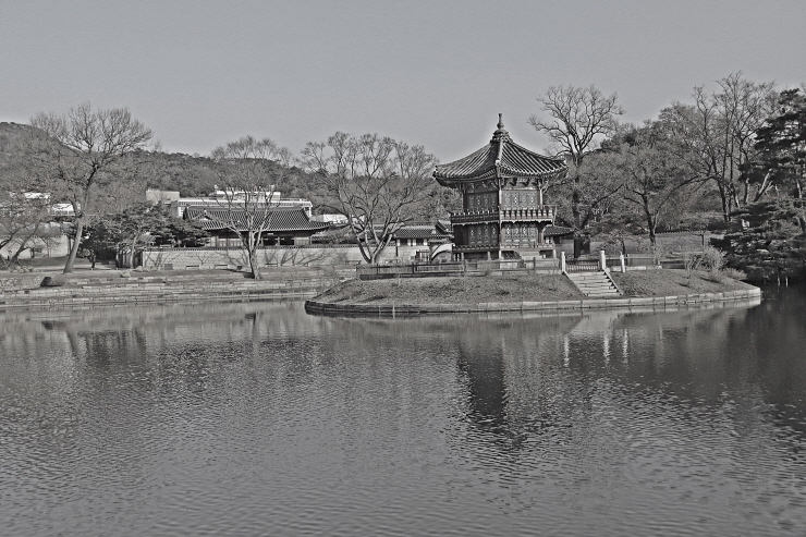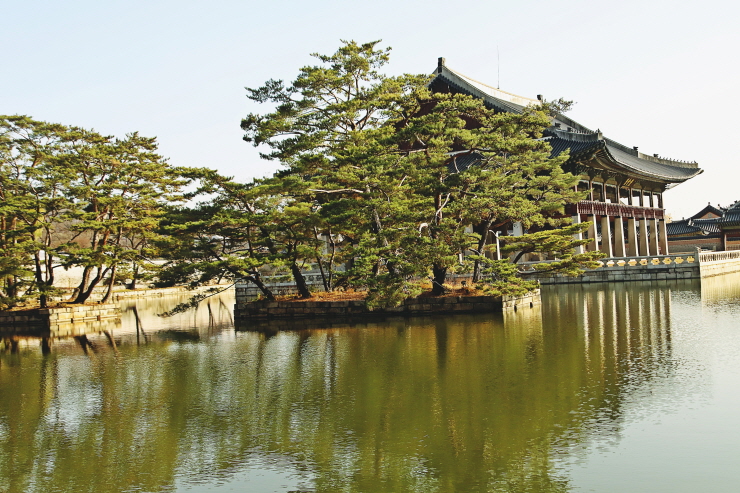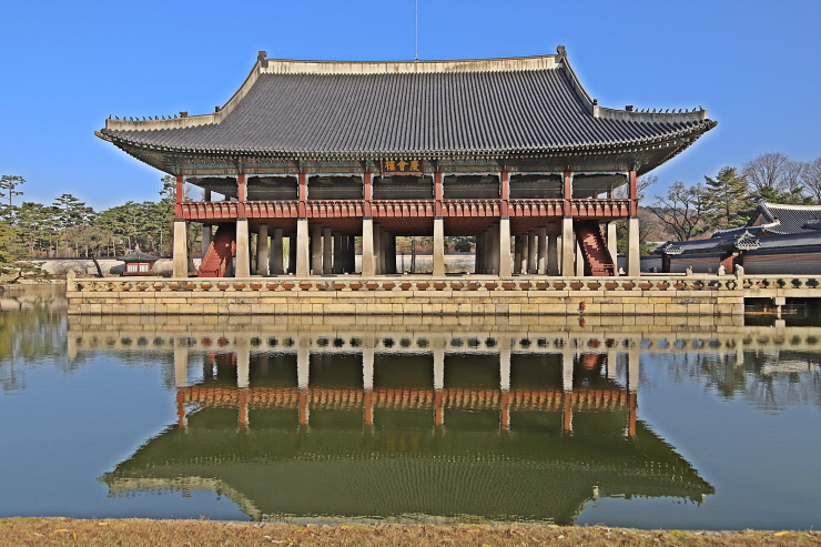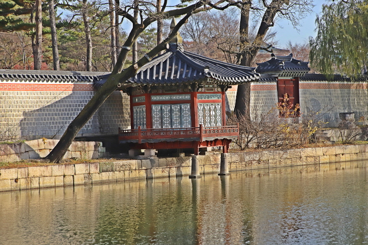 건물. 근정전 서북쪽에 있는 방형 연못 안에 세운
