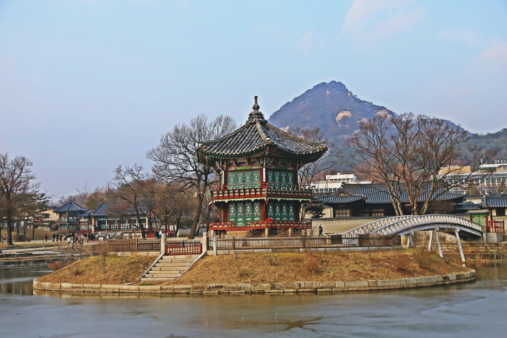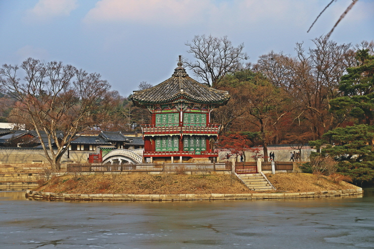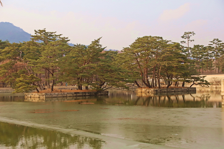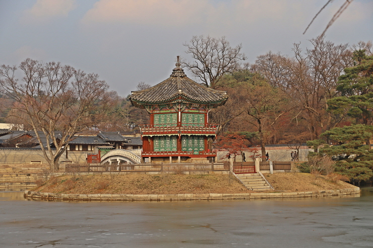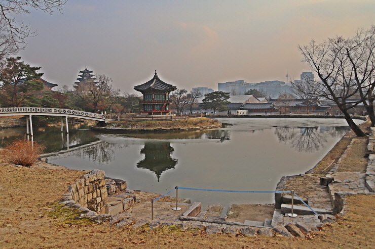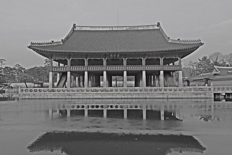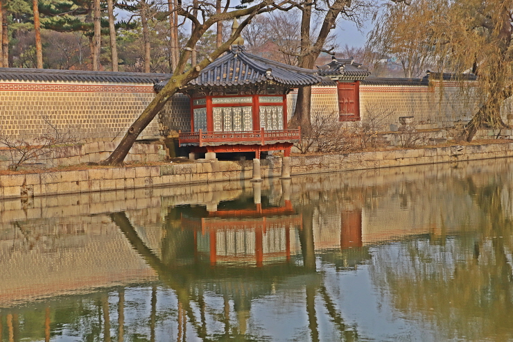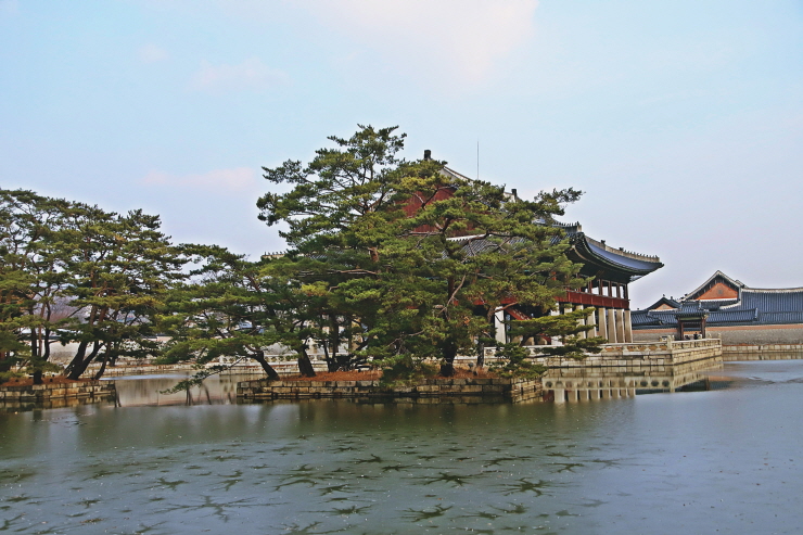 건물. 근정전 서북쪽에 있는 방형 연못 안에 세운