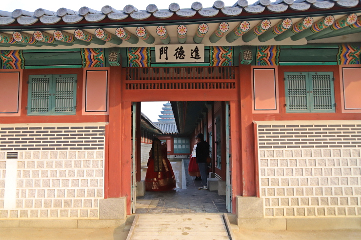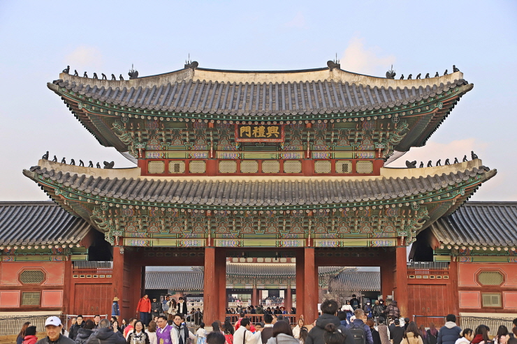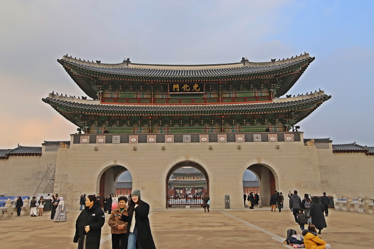 앞면 3칸, 옆면 2칸의 2층 문루인 근정문의 좌우에 일화문